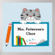 Personalize este poster de sala de aula personalizado de um gato segurando faixa branca com o nome do professor e o lápis e livros em primeiro plano. Irá iluminar qualquer classe de ensino fundamental. A cor de fundo também pode ser alterada.