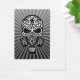Este crânio apocalíptico posto está equipado com uma máscara de gás grande. As linhas e as espirais isoladas decoram a testa e as bochechas no estilo do Dia dos Crânios do Açúcar Morto. Raios de luz brilham em todas as direções que emanam de trás do crânio. Esse padrão simétrico é um na moda gráfico com tema apocalíptico postado.