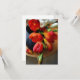 freesias vermelhas e brancas num pote de argila com efeito pastoso