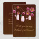 O dia perfeito de toda noiva inclui suas amigas. Quem você confia para dar um discurso e realizar tarefas como ajudá-la a escolher os vestidos das damas de honra para que o plano do seu casamento ocorra sem problemas? Seja sua irmã responsável, prima, sobrinha ou melhor amiga, este convite "Você será minha Dama de Honra" é uma maneira divertida de perguntar. Personalize o cartão alterando o texto nos campos fornecidos. Você pode alterar o estilo, tamanho e cor da fonte, tipo e estilo de papel.