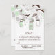 Ilustrações caprichosas de potes de vidro pendurados em uma árvore com cordas de coração, dois passarinhos e uma variedade de flores. Este cartão de resposta de casamento tem itens correspondentes. Este convite de pote de vidro seria perfeito para casamentos de primavera, inverno e ao ar livre.