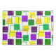 Esta fronha tem um design geométrico de quadrados em roxo, amarelo e verde espalhados com seus contornos.