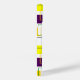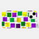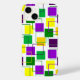 Esta capa de telefone tem um design geométrico de quadrados em roxo, amarelo e verde espalhados com seus contornos.