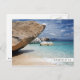 Cartão postal das grandes pedras de pedra na areia e no mar Mediterrâneo na praia de Cala Mariolu, na ilha da Sardenha, Itália, com um bar fraco e o texto: "Sardenha".