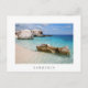 Cartão postal das grandes rochas na água e na areia da praia de Cala Mariolu, no Golfo de Orosei, na costa de Emerald, da ilha da Sardenha, no mar Mediterrâneo, Itália com uma fronteira branca e o texto: "Sardenha".
