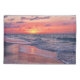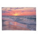 Assistindo um lindo pôr do sol tropical em uma praia das Bahamas. As ondas do mar se chocam contra a costa arenosa das ilhas com o brilhante reflexo da luz solar em tons coloridos de rosa, amarelo e roxo. Lembra-me de dar uma volta na praia no paraíso das Bahamas!