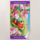 Grande jardim do joaninha de toalha de praia. Borda roxa. Joaninha que está sendo perseguido por flores amigáveis de Snapdragon.