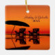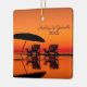 Uma cena da praia com o ajuste do sol quando as ondas de oceano que deixam de funcionar acima com as 2 cadeiras vazias na água. Personalize adicionando seus nomes e um ano.