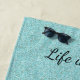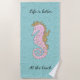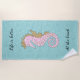 A bela glitter aquática emula água tropical espumante com um cavalo de mar rosa mágico fluindo seu mané de ouro reluzente. Personalize seu próprio texto ou deixe como está. Torne suas férias especiais com esta única toalha de praia com tema oceânico.