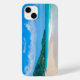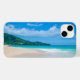 Linda praia tropical com água turquesa, céu azul com nuvens brancas e areia branca. Paraíso com uma montanha verde e luxuosa na ascensão a distância do horizonte do oceano.