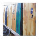 As prancha do vintage na praia de Montauk repurposed para formar uma cerca artística. Prancha de madeira em uma variedade de cores que variam da cerceta, do mel do amarelo, o ambarino e do trigo. Paraíso dos surfistas em Montauk, New York. Fleetphoto