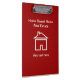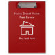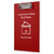 Prancheta acrílica feita sob encomenda do negócio com imagem gráfica de um símbolo da casa em lados e em modelos que vermelhos da cor e do texto do fundo você pode personalizar em linha. Projetado para um corretor imobiliário, um corretor de imóveis, um agente, ou uma agência. Uma prancheta lateral dobro moderna simples para promover seu negócio.