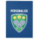 Prancheta personalizada do campo de ténis para o treinador profissional. Adicione seu próprio nome, logotipo, nome da equipe ou nome feito sob encomenda do clube. Ideia agradável do presente de aniversário para o treinador do segundo grau, o jogador, a mamã, o pai, os miúdos liga, as equipes, o professor, o instrutor, o instrutor pessoal, o instrutor da malhação, a escola, a bola de tênis amarela do recurso etc. e o logotipo cruzado das raquetes com modelo desportivo da tipografia. O conselho de grampo azul ou feito sob encomenda do fundo da cor. O dobro tomou partido impressão. Disposição da vista superior de linhas do campo de ténis e de dimensões do tamanho. Excelente para explicar táticas e estratégia.