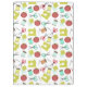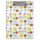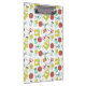 Uma prancheta que caracteriza um teste padrão temático sewing com ilustrações de uma máquina de costura, de um coxim do pino, de umas amostras de folha do tecido, de umas tesouras, de uma agulha, e de um carretel da linha.