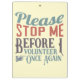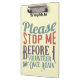 Recolha seu importante assinam acima folhas e unem-nas a sua muito própria prancheta voluntária. Excelente para voluntários de todos os tipos que querem ser lembrados: Pare-me por favor antes que eu me ofereça mais uma vez. O estilo da tipografia do vintage inclui um "que aponta a mão" para apontá-lo no sentido correto. Obrigado voluntário engraçado você presente.