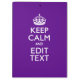 Seu personalizado "Mantenha Calma" dizendo em um fino e personalizado decor de cor de sotaque roxo. Um estilo personalizado de "Manter Calma" dizendo em um presente generoso. Humorístico ou caprichoso experimente suas palavras criativas em duas linhas editáveis de texto. Lembre-se de usar letras CAPITAL para obter melhores resultados.