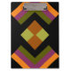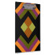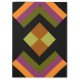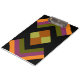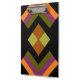 Design com um diamante verde e marrom no meio e triângulo em roxo verde e laranja no topo e no fundo.