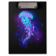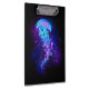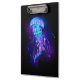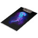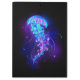 Água-viva grande, azul, desenhada artisticamente, brilhante, brilhante, com longos tentáculos sobre fundo preto com bioluminescência roxa. Água-viva luminosa.