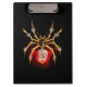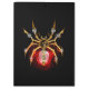 Aranha mecânica, com pá-pá de ouro, engrenagens de latão e uma lâmpada de vidro vermelha sobre fundo preto. Estilo Steampunk.