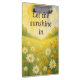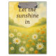 Uma clara ilustração aquosa de um prado ensolarado cheio de margaridas brancas e flores alaranjadas, com a frase "Deixe o sol entrar" em texto marrom-negrito contra um sol amarelo brilhante e céu azul macio.