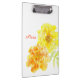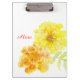 Arte aquosa solta de flores amarelas laranja-douradas numa prancheta. Personalize com seu próprio nome. Impressão de arte original produzida com aquarelas pan por Sarah Trett.