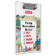 Camp ou Road Trip Clipboard Exclua o texto e substitua-o pelo seu próprio. Escolha sua cor, tamanho e estilo de fonte favoritos. Torne-o seu próprio nesta prancheta dupla. Feliz acampamento!! Estilo: a área de transferência fique organizada e incrivelmente na moda, com pranchetas personalizadas do Zazzle! Use seu design, imagens ou texto favorito para transformar esse suprimento básico de escola em um cúmplice espantoso, que o manterá no controle, sempre! Dimensões: 12,5" l x 9" w; espessura: 0,125" Projetada para papel tamanho carta e A4 Possui até 0,5 polegadas de papel com segurança Made de acrílico ultra-durável Impresso em ambos os lados /!\ ADVERTÊNCIA:RISCO DE CORTE - peças pequenas. Não para crianças com menos de 3 anos.