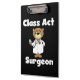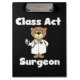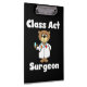 Uma prancheta de design do médico de emergência fofo que qualquer cirurgião certamente ama, apresenta um médico urgião com casaco de laboratório e estetoscópio e texto branco que lê Cirurgião de Classe Act em um fundo preto.