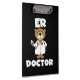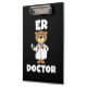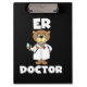 Uma prancheta de design do médico de emergência que qualquer médico da sala de emergência certamente ama, apresenta um médico de ursos de pelúcia com casaco de laboratório e estetoscópio e texto branco que lê Médico de Urgência em um fundo preto.