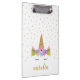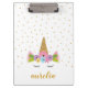 Uma prancheta com um unicórnio mágico giro com flores pastel e buzina brilhante adornada com confete brilhante.