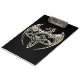 Um lindo dragão branco prateado brilhante com asas espalhadas e decoradas com três nós pontiagudos, o corpo espiralando em um terceiro nó triplo sobre um fundo preto.