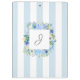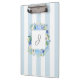 Uma área de transferência personalizada com estilo feminino em chic, esta design tem um fundo azul claro e branco de faixa de awning com um quadro floral quadrado ao redor do seu monograma com lindos florins azuis e brancos mistos. Edite o monograma com o texto inicial ou outro desejado. Este design é repetido na frente e na parte traseira da área de transferência.