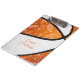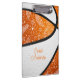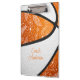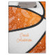 Esta prancheta temática de basquete divertida apresenta a imagem realista de uma bola de basquete laranja e branca abstratamente superdimensionada que tem delicadas flores doodle desenhadas à mão, penas e padrões de paisley nas painéis laranja da bola de basquete - personalize com o nome do treinador ou atleta - por katz_d_zynes