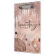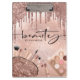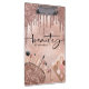 Quadro de recorte de Beleza Dourada moderna, chic e moderna. O design apresenta pingos de brilho sujo, cosméticos e ícones de maquilhagem com folha de alumínio rosa, fundo brilhante brilhante e script de tipografia. Personalize com seu nome na frente.