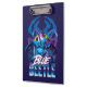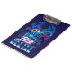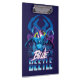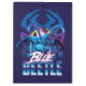 Veja este gráfico de estilo retrowave do Besouro Azul com o pôr do sol sobre a cidade!