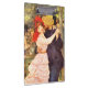 Pierre-Auguste Renoir. Bola no Moulin de la Galette. Retrato de grupo em cores quentes. Na rua, uma garota e um homem estão dançando em pares. Atrás deles há uma mesa na qual pessoas estão sentadas. Há árvores no fundo. Reprodução de famosas imagens de arte no dominio público.