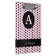 Design apresenta um fundo cor-de-rosa para um padrão polka-dot preto. Frente exibe a inicial que você fornece em letras cor-de-rosa contra um oval preto. A parte inferior exibe o nome ou texto em um script cor-de-rosa contra uma faixa preta. O design traseiro apresenta um fundo rosa sólido. O valor inicial é exibido em preto no canto inferior direito.