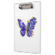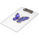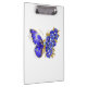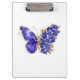 Borboleta de flores cinza, azul, safira, espumante com asa decorada com flores preciosos azuis com folhas de ouro sobre fundo branco.