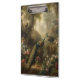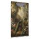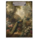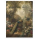pintura botânica vintage de três pavões num jardim inglês cercado por flores pastel