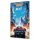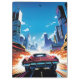 Uma representação cômica de um carro esportivo que corre em uma estrada em direção a uma cidade. Cores brilhantes, muita ação, design totalmente divertido nesta área de transferência.