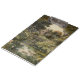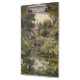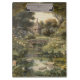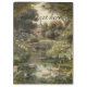 pintura em vintage de uma cena botânica de cisnes nadando na água em um jardim inglês com lírios, pontes e muitas flores exóticas