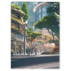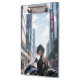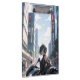 Pintura em estilo anime de uma jovem com cabelo preto curto em uma roupa preta parada perto de sua moto preta em uma rua movimentada da cidade.
