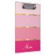 Mantenha-se organizado em estilo com esta prancheta chic, adornada com uma série de listras cor-de-rosa que vão de pastéis macios a matizes negros. Linhas Douradas separam as cores, acrescentando um toque de luxo à design. Personalize-o com seu nome, monograma ou qualquer texto que você quiser, ou mantenha-o simples removendo o texto de amostra. Esta área de transferência combina moda e funcionalidade, fazer-a um acessório perfeito para o seu escritório ou um presente pensativo.