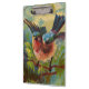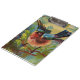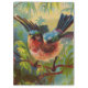 Este impressão colorido ilustra um pássaro azul que repousa num galho numa floresta cheia de flores. Esta vista mostra o pássaro que está prestes a voar. As cores azul-claro, rosa, amarela e verde fazem uma imagem excitante para decoração e acessórios pessoais.