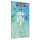 Mantenha notas importantes nesta área de transferência personalizada de cor azul lacrimogênea RN. Tem um design moderno com fundo aqua azul e lacrimejante verde. Um símbolo caducius branco e "RN" estão no centro da frente. Personalizado com o nome na letra do script teal trendy mais escuro no centro inferior. Clique na opção personalizar modelo e digite o nome.