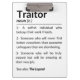 Uma definição humorística de "Traidor" é apresentada como uma entrada no dicionário com tom sarcástico, sugerindo que o termo se refere a um valioso colega de trabalho que está saindo para um novo emprego. Ele classifica brincalhão o funcionário que parte como um traidor para deixar amigos para trás, mas também reconhece seu potencial de grandeza em seu próximo papel.