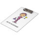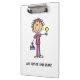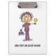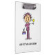 Uma prancheta de excelente para enfermeiras, mostra uma enfermeira de cabelos castanhos em um uniforme roxo que aparentemente só desenhou sangue e está oferecendo um pirulito!