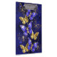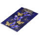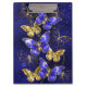 Composição de borboletas luxuosas de safira e joias de ouro em fundo azul texturizado.