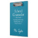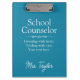 Uma prancheta limpa e moderna feita apenas para conselheiros escolares. Apresentando um layout minimalista em um fundo calmante e profundo, este design destaca o título "Conselheiro Escolar" em uma letra de na moda, com espaço para personalizar sua própria mensagem ou citação por baixo, além do seu nome na parte inferior para um toque profissional. Perfeito para uso diário ou como presente pensativo durante a Semana de Apreciação, a graduação ou a época de volta à escola.