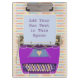 Este design retro bonito da prancheta da máquina de escrever é para escritores/escritores/journalistas/autores ou qualquer um criativo mais quem ama máquinas de escrever do vintage. A antiguidade 60s - a máquina de escrever do estilo tem um coração no meio e o espaço para você adicionar seu próprio texto personalizado. O fundo tem uma caneta leve da tinta repetir o teste padrão com uma aguarela/efeito pintado.