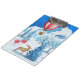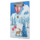 Gorgeous illustration of a deer in the snow near a cozy little cottage in a magical winter landscape, with a hot air balloon in the icy blue sky.